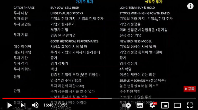 유튜브를 찾아보면 성장주와 가치주를 구분해서 설명해주는 영상이 많다. 뭐가 나쁘고 뭐가 좋다고 단정지을 수 없다. 수익만 나면 모두 좋다. 다만 안정성을 중시한다면 가치투자를 추천한다. 아래에서도 모두 가치투자를 언급하겠다.